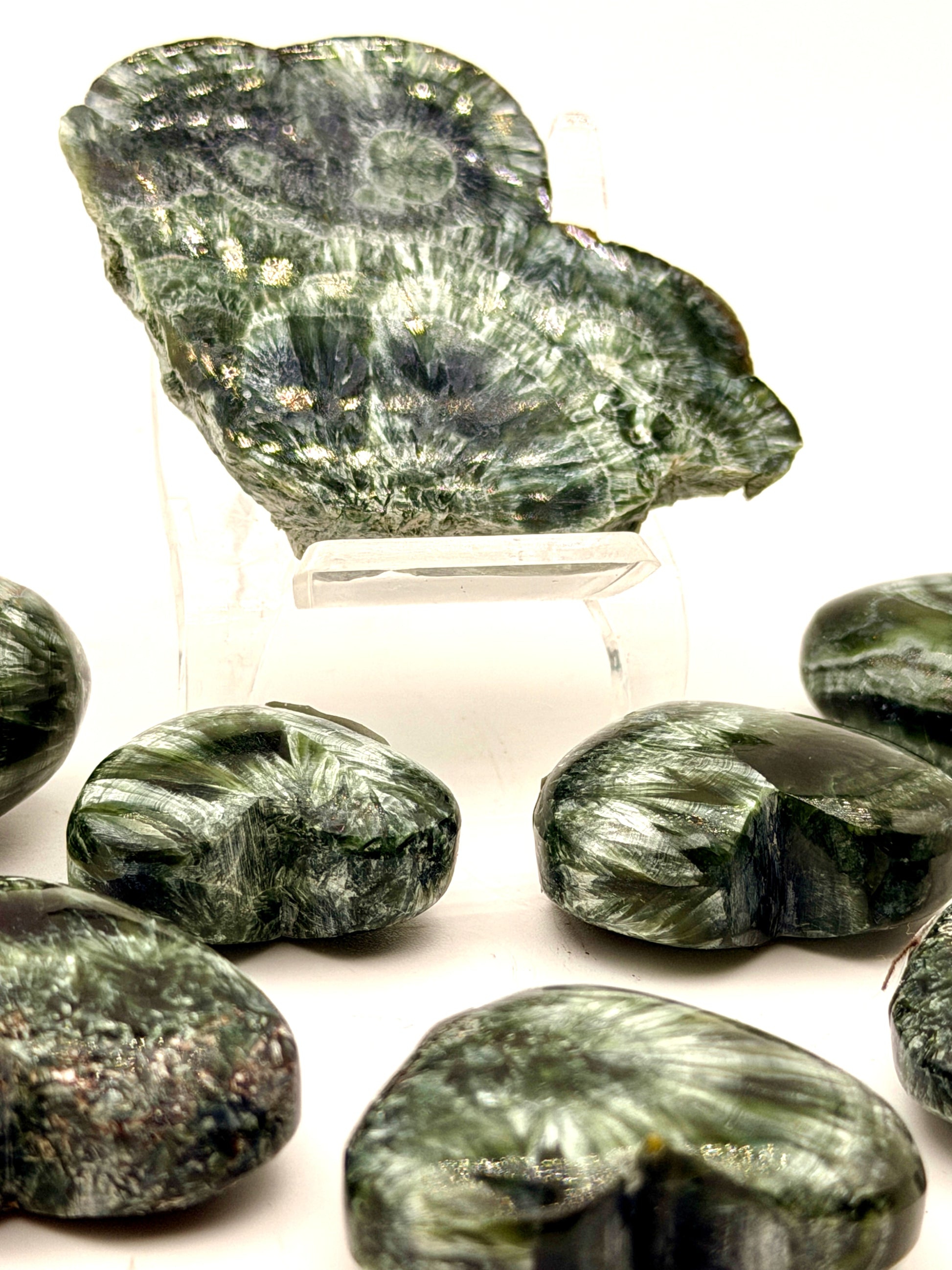 Seraphinite forms within the ancient metamorphic belts of Siberia, where intense heat and pressure create deep forest‑green stone streaked with shimmering silver “feathers.” These luminous patterns come from fine mica inclusions that catch the light like moving wings, giving the stone its unmistakable sense of motion. Each piece feels alive — a natural fusion of earth‑born depth and celestial shimmer.